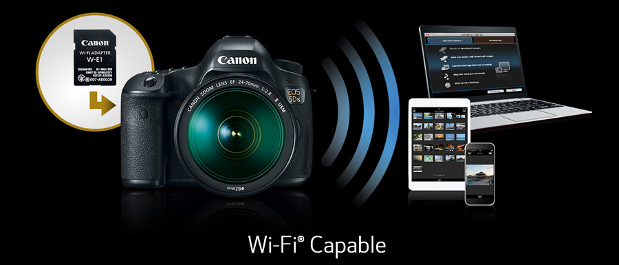 S WIFI adaptérom W-E1 je prístroj schopný komunikovať s komaptibilnými zariadeniami (smartfónmi, tabletmi a počítačmi) a jednoducho byť tak na diaľku ovládaný (pomocou EOS Utility software). Pomocou WIFI môžete aj prezerať alebo šťahovať fotografie do svojho zariadenia. Táto možnosť rozširuje využiteľnosť prístroja na diaľkové snímanie i rýchle zdieľanie fotografií.