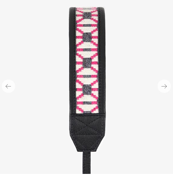 Nastaviteľný remienok na krk fotoaparátu vyrobený z ručne vyrobenej bavlnenej látky z Rajhastanu (India) a mäkkej prémiovej hovädzej kože na zadnej strane.