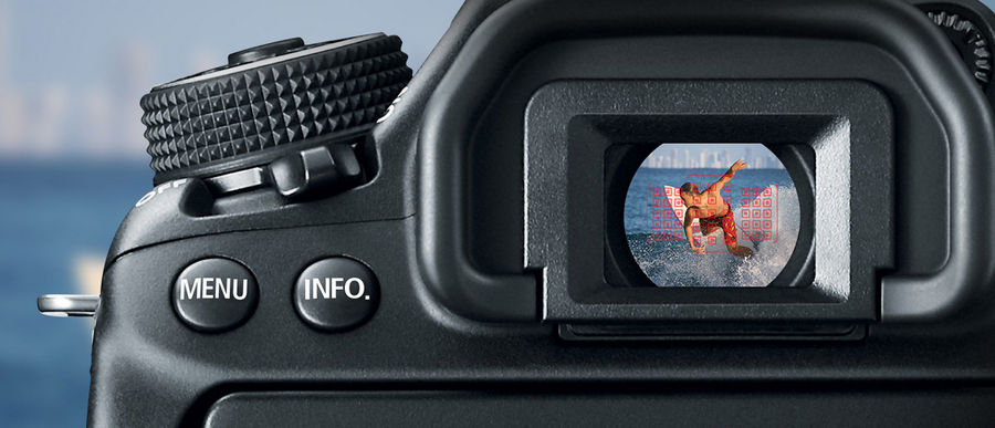Zadnej strane fotoaparátu kraľuje 3,2“ LCD displej technológie Clear View LCD II so 100% zobrazením uhla záberu, širokými až 170° vertikálnymi aj horizontálnymi sledovacími uhlami s rozlíšením 1 620 000 Pix. Okrem LCD je na zadnej aj veľký hľadáčik založený na optickom hranole so 100% pokrytím uhla záberu a 0,76x zväčšením, ktorý vám na zabudovanom priehľadnom LCD displeji zobrazí všetky dôležité informácie o zaostrení, expozícii, zábleskovej expozícii, kompenzácii expozície, vyvážení bielej, nastavení fotoaparátu, režime fotografovania, formáte zaznamenávaných fotografií, varovanie o stave fotoaparátu, stave nabitia batérie ako aj zostávajúcej kapacite pamäťovej karty prepočítanej na počet fotografií.