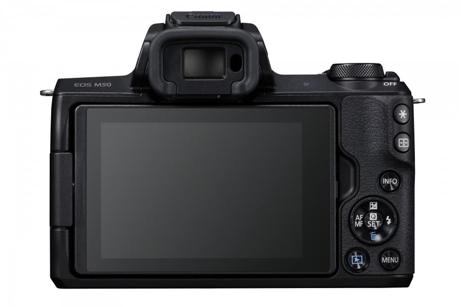 Canon EOS M50 (telo) je špičkovo vybavený digitálny kompaktný systémový fotoaparát pre náročných užívateľov. Vybavený je 24,1MPix CMOS snímačom veľkosti APS-C, ktorému asistuje rýchly obrazový procesor DiG!C 8. Táto kombinácia umožňuje fotoaparátu zaznamenávať špičkové fotografie a 4K videá s mimoriadne malým šumom v celom rozsahu natívnej citlivosti snímača (ISO100 – ISO25600). Fotoaparát je vybavený 143 bodovým automatickým zaostrovaním pracujúcim na TTL princípe vyhodnocovania fázového rozdielu. O vyhodnocovanie expozície sa stará 384 zónový merací systém. Elektronicky riadená uzávierka fotoaparátu umožňuje pracovať s expozičnými časmi v rozsahu od 1/4000 po 30sec. Fotoaparát umožňuje fotografovať rýchlosťou až 10obr./sec. pre až 10 RAW, alebo 33 JPEG fotografií v rade za sebou. Fotoaparát má vstavaný výklopný blesk so smerným číslom 5m (ISO100) a nad hľadáčikom hot-shoe päticu pre pripojenie externého systémového blesku s X-synchro kontaktom synchronujúcim do 1/200s. V hornej časti fotoaparátu sa nachádza elektronický OLED hľadáčik s uhlopriečkou 0,39“ a 100% zobrazením obrazového poľa. Na zadnej časti fotoaparátu sa nachádza dotykový, výklopný a otočný 3“ TFT LCD monitor s rozlíšením 1 040 000Pix a 100% zobrazením obrazového poľa. Vo výbave fotoaparátu nechýba ani vysokorýchlostný micro USB 2.0 konektor, micro HDMI konektor, vstavaný Wi-Fi a Bluetooth modul. Fotoaparát je vybavený bajonetom Canon EF-M vďaka ktorému naň nasadíte všetky objektívy vybavené bajonetmi Canon EF-M. Vďaka voliteľnému adaptéru Canon Mount Adapter EF-EOS M môžete na fotoaparát nasadiť aj objektívy vybavené bajonetmi Canon EF a Canon EF-S. Fotoaparát nie je utesnený voči vode ani prachu. Konštrukcia fotoaparátu je vytvorená z odolných plastov a kompozitov vďaka čomu je veľmi ľahká a pevná.