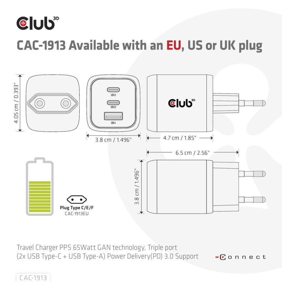 Club3D cestovná nabíjačka 65W GAN technológia, 3 porty (2xUSB-C + USB-A), PPS, Power Deliv