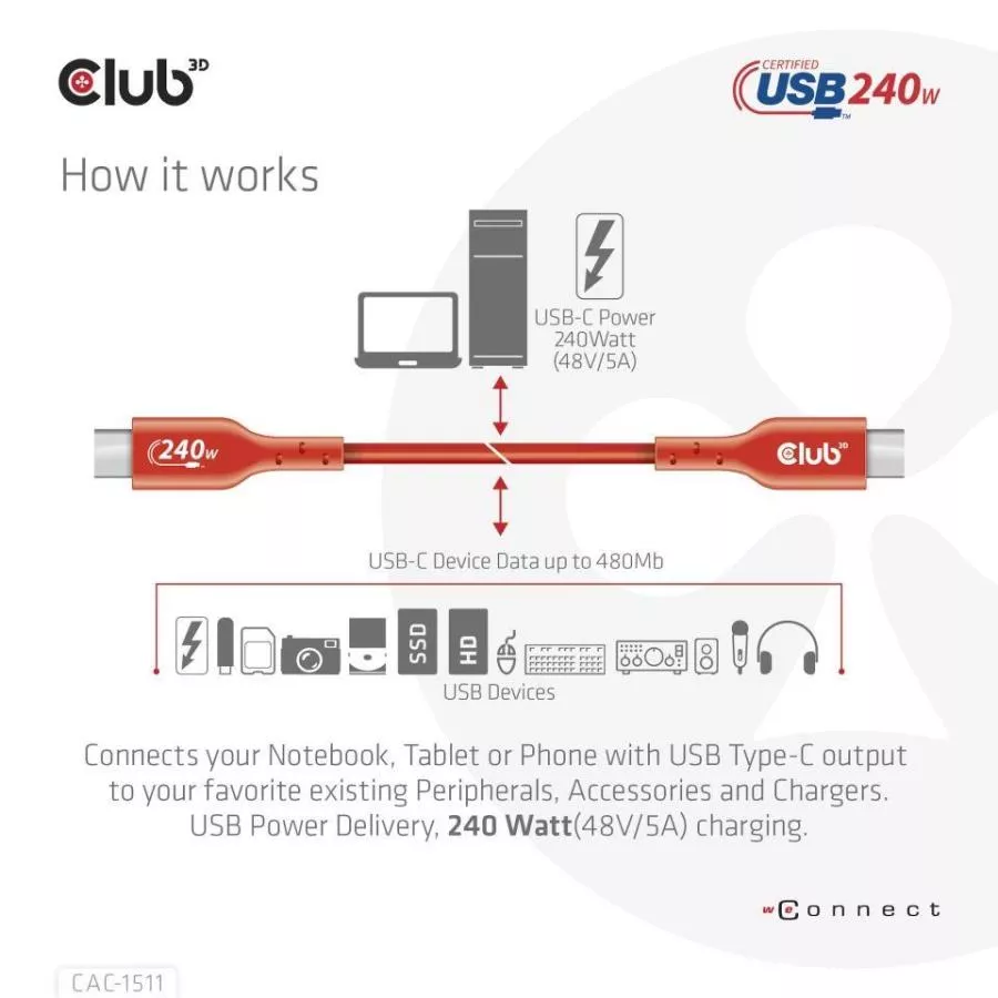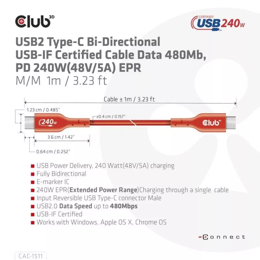 Club 3D CAC-1511 USB 2.0 Type-C certifikovaný kábel obojsmerný USB-IF, dáta 480 Mb, PD 240 W (48 V/5 A) EPR, rozšírený napájací rozsah M/M 1 m / 3,23 stôp pripojí váš notebook, tablet alebo telefón s výstupom USB Type-C na vaše obľúbené existujúce periférie, príslušenstvo a nabíjačky. Umožňuje dáta a napájanie cez jeden kábel a oboma spôsobmi. Tento kábel podporuje dáta USB 2.0 až do rýchlosti 480 Mb/s a výstup až 240 W (48 V/5 A) na nabíjanie alebo napájanie vášho notebooku, tabletu alebo smartfónu.
