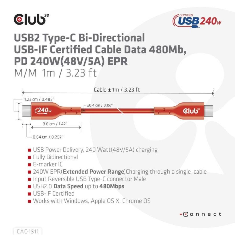 Club3D Kabel USB-C, PD 240W(48V/5A) EPR M/M 1m