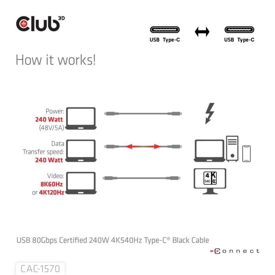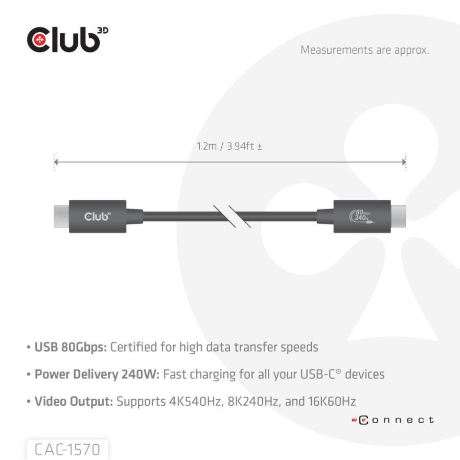 Club3D Kabel USB4 Typ-C, 80Gbps, Certifikovaný, 4K540Hz, 8K240Hz, 16K60Hz, PD 240W, čierny