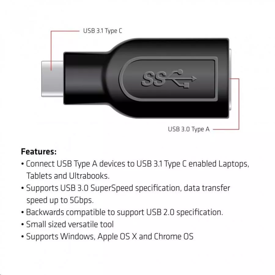 Adaptér je spätne kompatibilný a podporuje tiež rozhranie USB 2.0. Špecifikácia USB 3.0 SuperSpeed zaisťuje prenos rýchlosti 5 Gb/s pre rýchly prenos veľkých súborov.