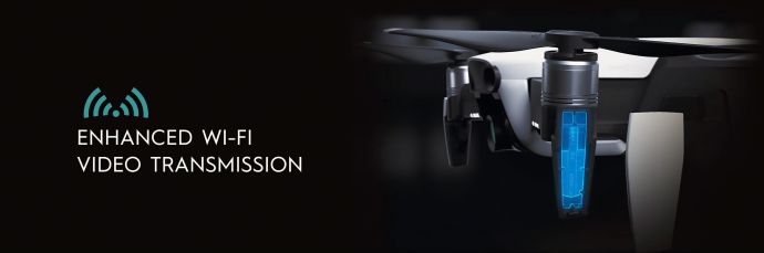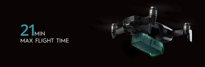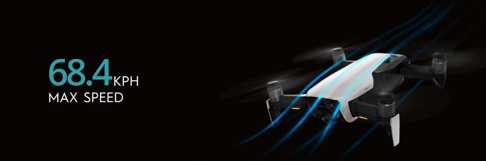 DJI Mavic Air je vybavený úplne novou DJI Mavic Air Inteligent Flight Battery, ktorá mu na jedno nabitie umožní vydržať vo vzduchu až 21min (pri bezvetrí). Dron dokáže vystúpať až do výšky 5000mnm a jeho dolet je maximálne 10km, pričom vzhľadom na dosah rádiového ovládania sa od riadiacej konzoly môže vzdialiť najviac na 4km. Pre diaľkové riadenie dronu môžete využiť s dronom dodávaný diaľkový ovládač DJI Mavic Air Remote Controller s ktorým môžete ovládať dron až na vzdialenosť maximálnu 4000m (FCC). Diaľkový ovládač má skladacie opierky pre smartfón do veľkosti 160mm a hrúbky 6,5-8,5mm, ktorý po pripojení k diaľkovému ovládaču slúži pre zobrazenie obrazu prenášaného z palubnej kamery. Komunikácia a prenos dát medzi ovládačom a dronom pracuje na frekvenciách 2400-2483GHz/5725-5850GHz. Pre ovládanie dronu je možné využiť aj špeciálne samostatne predávané okuliare, ktoré zobrazujú obraz prenášaný z palubnej kamery s opozdením 170-240ms. Okrem spomenutých dvoch možností je možné tiež využiť pre ovládanie dronu aplikáciu DJI GO 4, ktorú si môžete stiahnuť pre iOS aj Android zariadenia (smartfóny/tablety). Po spárovaní dronu a smartfónu/tabletu, môžete prostredníctvom tejto aplikácie sledovať obraz z palubnej kamery a ovládať dron do vzdialenosti 80m a výšky 50m. To čo je však na tomto drone najzaujímavejšie je jeho mimoriadne kompaktná skladacia konštrukcia, ktorú zdedil po predchodcoch z rady Mavic. Po zložení do prepravnej konfigurácie by sa tento minidron zmestil do krabičky s rozmermi 168x83x49mm čo je veľkosť krabičky od bežného 5“ smartfónu.