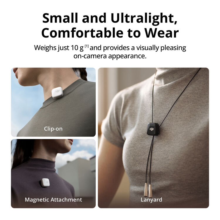 Vysielač DJI Mic Mini 2 váži približne 11 g, čo zaručuje pohodlné nosenie. Odnímateľná a otočná magnetická spona umožňuje flexibilné nastavenie uhla mikrofónu, či už je pripnutý zboku alebo hore nohami, a zaručuje tak ideálne snímanie zvuku v akejkoľvek situácii.