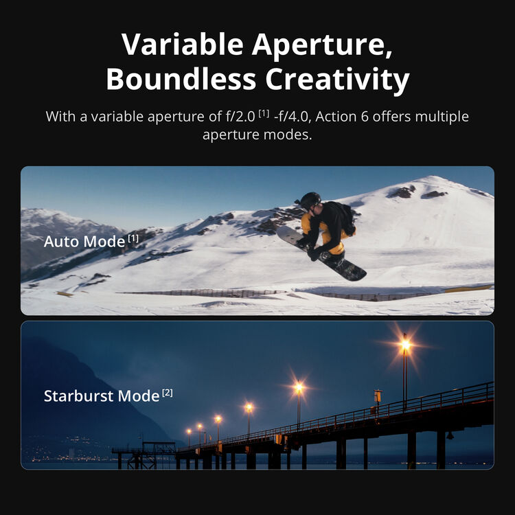 Ako prvá akčná kamera DJI s nastaviteľnou clonou f/2.0–f/4.0 sa Osmo Action 6 odkláňa od tradičného dizajnu s pevnou clonou a ponúka režimy clony vhodné pre širokú škálu scén.