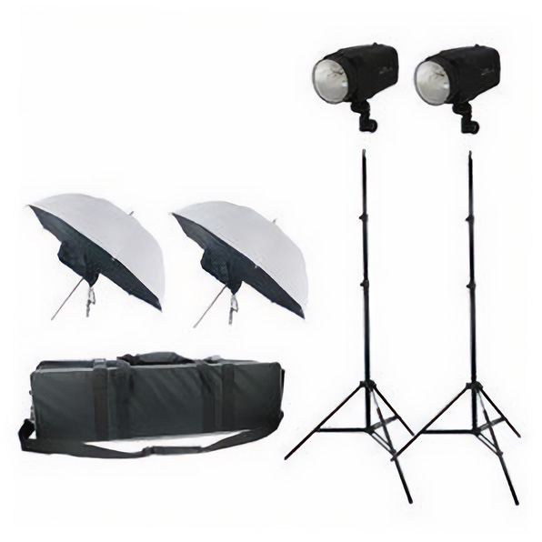 Set dvoch bleskov s dáždnikmi, statívmi a prepravnou brašňou. Synchronizácia bleskov s fotoaparátmi je možná jedine klasickým PC synchro káblom, ktorý je súčasťou balenia.