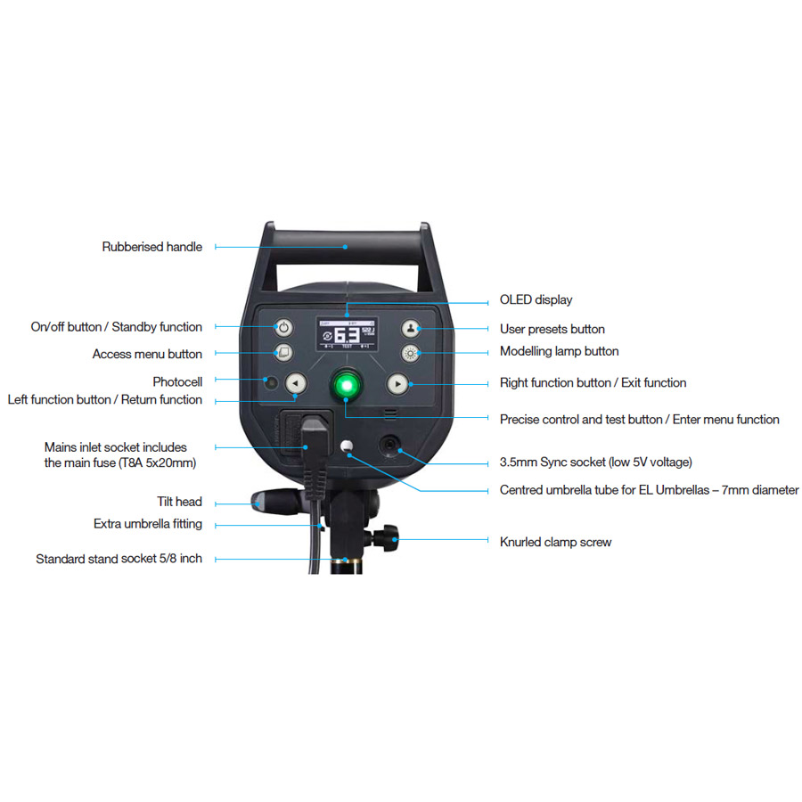švajčiarka presnosť zaručuje súlad výkonu a teploty farieb. Veľmi krátka doba záblesku (až 1/5000s @ t0.5) vám umožní zmrazit pohyb, ako nikdy predtým. Nový unikátny užívateľský OLED displej poskytuje fotografom všetky informácie, ktoré potrebujú. Teraz jedným pohľadom budete mať informácie o výkonu vo Ws i Jouloch, dobe záblesku a mnoho ďalšieho. Kruhový ovládač pre rýchlu navigáciu v menu na OLED displeji.