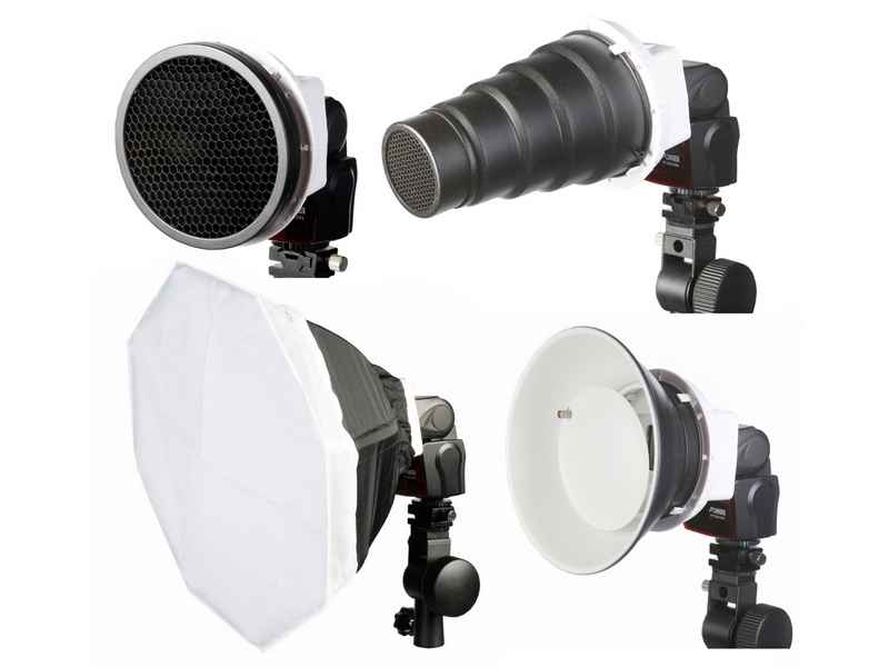 Kreatívny set pre externé systémové blesky, ktorý pozostáva z komínkového reflektora s voštinovým filtrom, „beauty dish“ reflektor, 29 cm oktagón box a voštinový filter. K setu je nutné dokúpiť adaptér na Váš blesk.