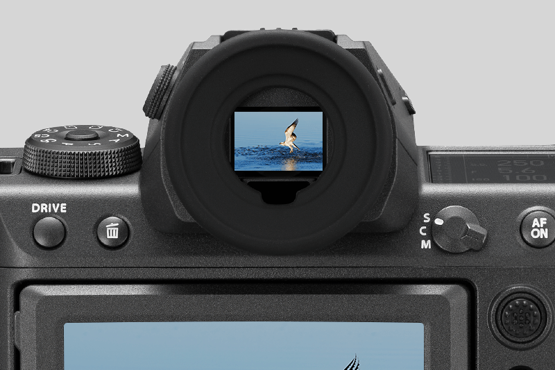 Fotoaparát je vybavený EVF s vysokým zväčšením a vysokým rozlíšením 9,44 milióna bodov s 1,0-násobným zväčšením. Potláča paralaxu a skreslenie, ku ktorému zvyčajne dochádza pri zmene polohy oka pri používaní hľadáčika, čím poskytuje výbornú viditeľnosť. EVF sa môže pochváliť plynulou obnovovacou frekvenciou cca. 120fps na presnú identifikáciu rýchlych pohybov objektu.