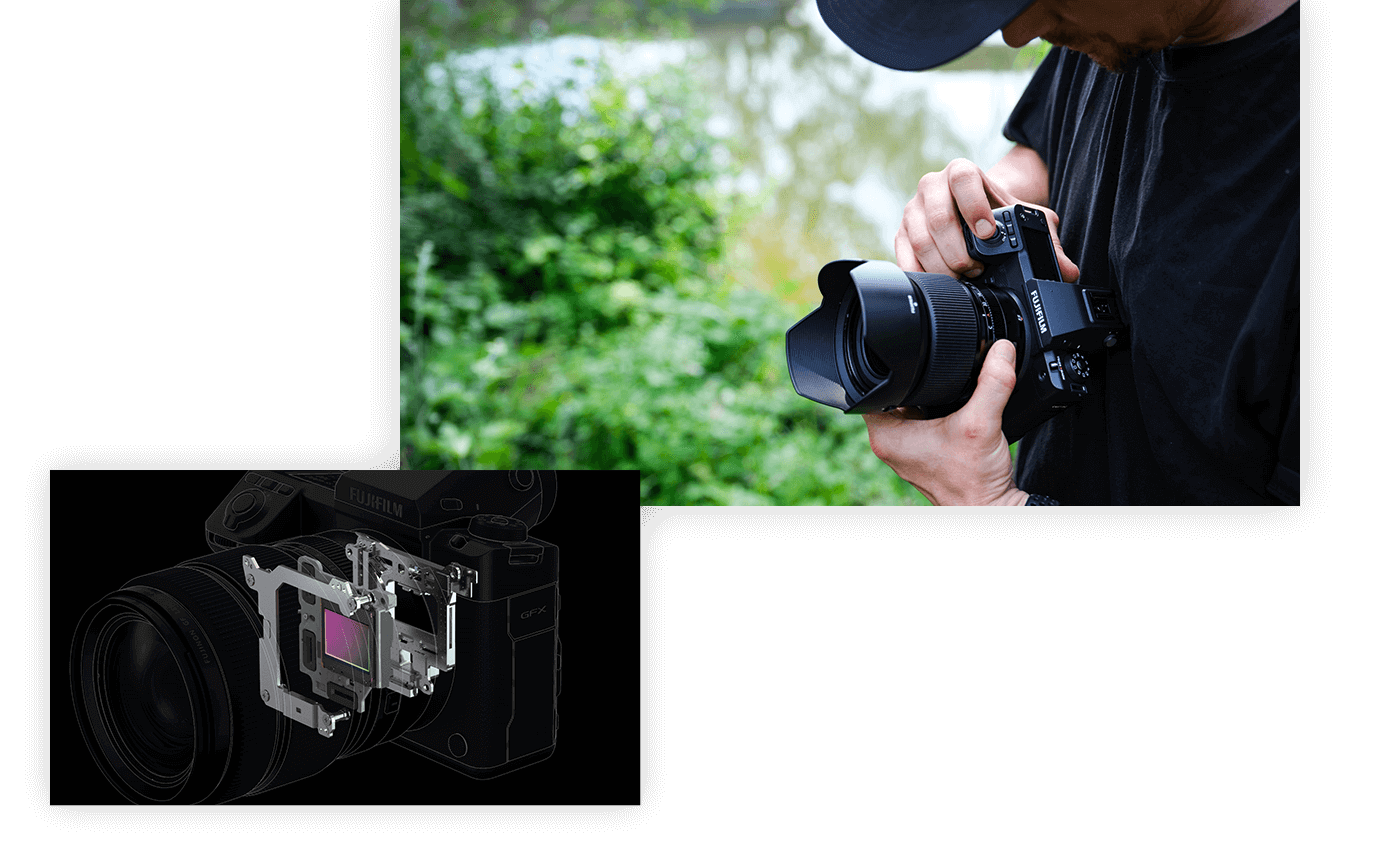 GFX100 II má nový mechanizmus IBIS, ktorý zvyšuje presnosť stabilizácie pomocou obrazových informácií na detekciu chvenia fotoaparátu. Výsledkom je až 8EV päťosovej stabilizácie, najlepší spomedzi fotoaparátov Fujifilm. Používatelia môžu ľahko snímať z ruky aj pri slabom osvetlení, ako je nočná krajina. Tento mechanizmus IBIS sa tiež používa na posúvanie obrazového snímača s vysokou presnosťou pri funkcii Pixel Shift Multi-Shot.