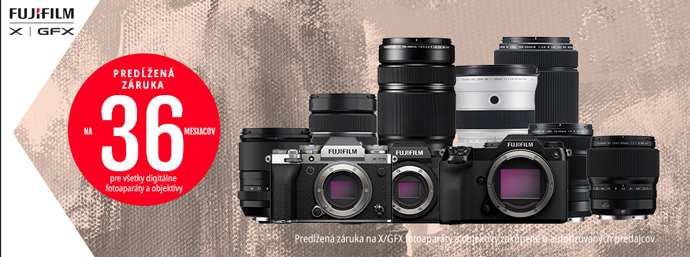 Ak si teraz zakúpite akýkoľvek digitálny fotoaparát alebo objektív Fujifilm radu X/GFX získate predĺženú záruku na 36 mesiacov (+1 rok). Akcia platí od 1.2. do odvolania. Podmienkou uplatnenia predlĺžnej záruky je doloženie zákaznického dokladu o kúpe s nákupom vrámci uvedeného obdobia.