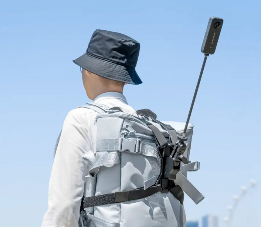 Držiak obsahuje polohovateľný kĺb a tyč z uhlíkového vlákna. Po uchytení k batohu môžete točiť zábery z pohľadu tretej osoby.