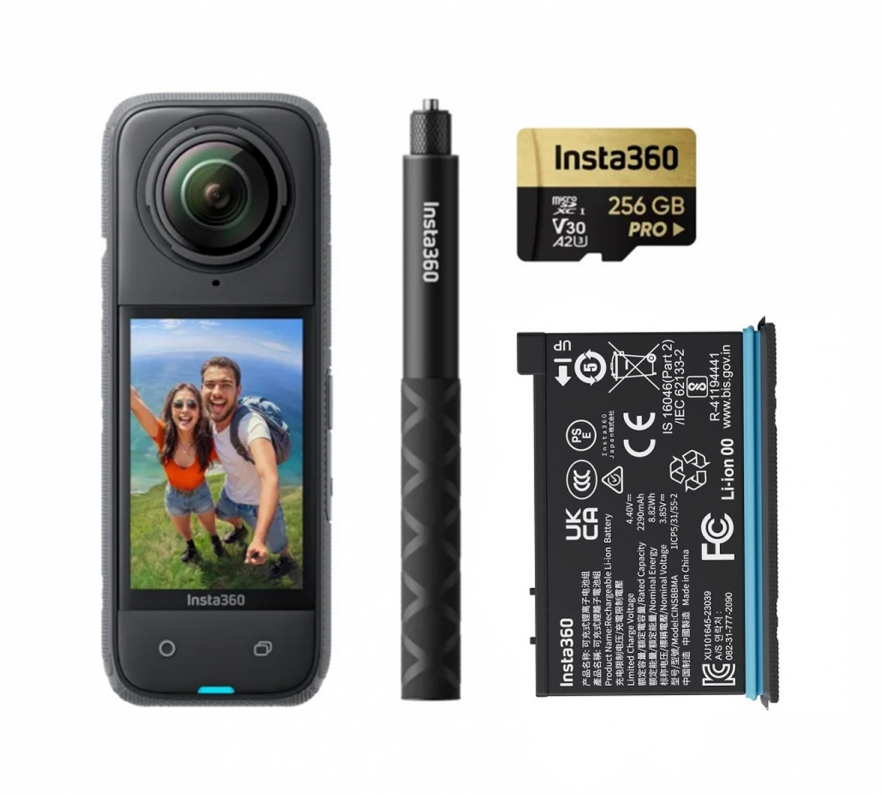 Cestovateľská sada s 360 ° kamerou Insta360 X4 obsahuje navyše Selfie tyč 114cm, ďalšiu batériu, a rýchlu 256GB kartu. Rozlíšenie 360 ??° videa je 8K / 30fps, pri 4K až 100 fps. Veľký snímač 1/2' pre perfektné zábery v horších svetelných podmienkach. Foto rozlíšenie až 72Mpx. Kvalitná robustná konštrukcia, veľký dotykový 2,5“ displej, vodotesná do 10 m. Účinná stabilizácia FlowState so 6osým gyroskopom. Batéria s veľkou kapacitou 2290 mAh. Ovládanie gestami, hlasové ovládanie 2.0. Video módy Video, Active HDR, Timelapse, TimeShift, Bullet Time, Loop Recording, Pre-recording. Rozmer kamery: 46 x 123,6 x 37,6 mm.