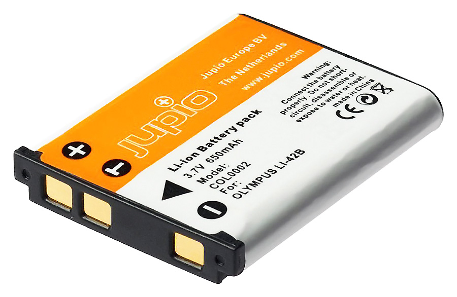 Jupio LI-42B je alternatívny Li-Ion akumulátor, ktorým môžete nahradiť akumulátory Olympus LI-40B / LI-42B / L38KA. Tento alternatívny Líthium-Iontový akumulátor s pracovným napätím 3,7V má kapacitou 650mAh a je bez problémov zameniteľný s originálnymi akumulátormi Olympus. Akumulátor je kompatibilný s digitálnymi kompaktnými fotoaparátmi Olympus D630 / Olympus FE-150 / FE-190 / FE-230 / FE-240 / FE-250 / FE-340 / FE-350 / FE-360 / FE-5500 / Olympus mju 700 Digital / mju 720SW Digital / mju 725SW Digital / mju 730 Digital / mju 740 Digital / mju 750 Digital / mju 760 Digital / mju 770SW Digital / mju 780 Digital / mju 820 Digital / mju 830 Digital / mju 840 Digital / mju 850 Digital / mju 1200 Digital / Olympus IR-300 / Olympus SP-700 / Olympus X-600 / X-750.