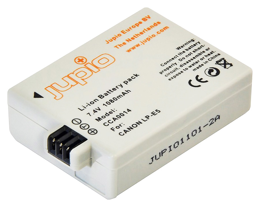 Jupio LP-E5 je alternatívny Li-Ion akumulátor, ktorým môžete nahradiť akumulátory Canon LP-E5. Tento alternatívny Líthium-Iontový akumulátor s pracovným napätím 7,4V má kapacitou 1080mAh a je bez problémov zameniteľný s originálnymi akumulátormi Canon. Akumulátor je kompatibilný s digitálnymi zrkadlovkami Canon EOS 450D / EOS 1000D.