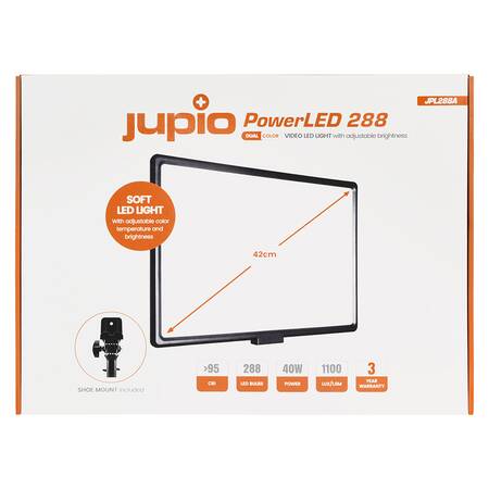 <b>Jupio svetlo PowerLED Light JPL288A</b> DUAL COLOR disponuje 288 LED diódami s možnosťou regulácie teploty a intenzity svetla. Displej LCD zobrazuje momentálnu jas s teplotou farieb, ako aj informáciu o batérii. Ľad svetlo môže fungovať na jednu alebo dve lítiove batérie Sony NP-F ( NP-F970 / F750 / F550 ), alebo na sieťový adaptér. Je vhodný na osvetlenie scény pri natáčaní videa a fotografovanie.