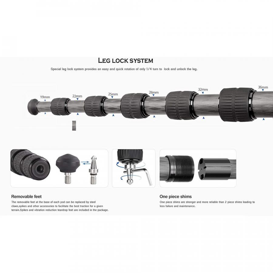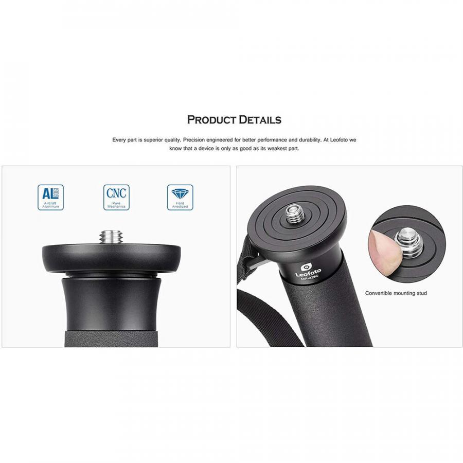 Monopod je vybavený penovou rukoväťou a zaisťovacím popruhom na zápästie. Hodí sa najmä pri fotografovaní športu, divokej zveri alebo natáčanie videa. Odnímateľná gumová pätka zabraňuje posuvu monopodu na hladkých povrchoch a dobrú priľnavosť na nerovnom teréne.