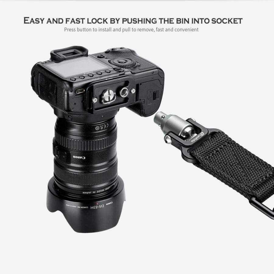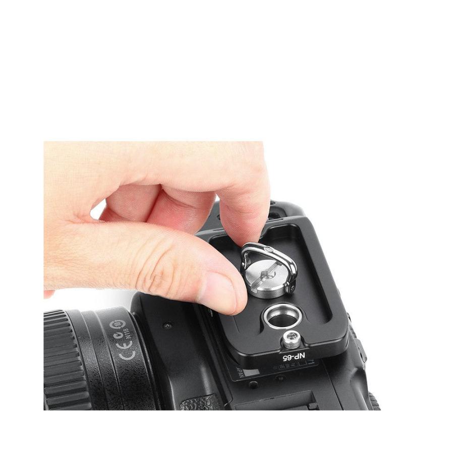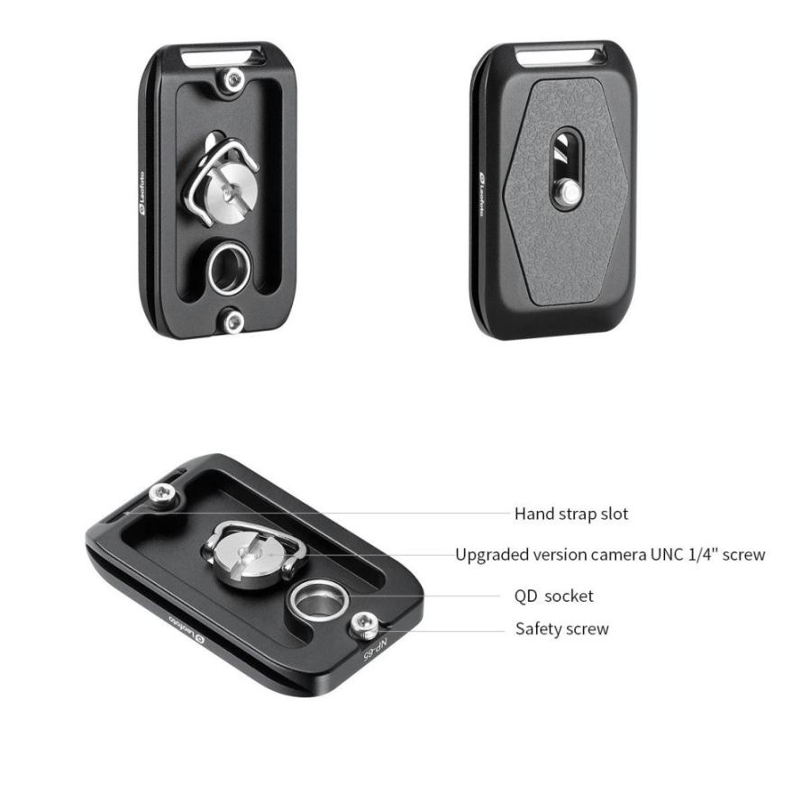 Doštička pre fotoaparát Arca-swiss dĺžky 65 mm vybavená zámkom QD pre pripojenie popruhu Leofoto.