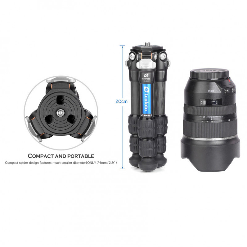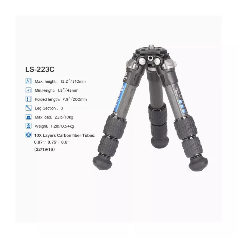 Maximálna nosnosť statívu je 10 kg. To je ideálne pre bezzrkadlovku, alebo pre DSLR s menším až stredným teleobjektívom. Celá zostava je extrémne ľahká. Karbónový statív LS-223C váži 530 g. Je teda dokonalým príslušenstvom pre cestovanie, napríklad aj do väčšieho vrecka.