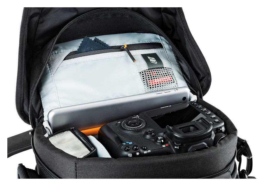• Priestor hlavnej komory je možné individuálne organizovať pomocou oddeľovacích polstrovaných priehradiek na suché zipsy, ktorými modulárne prispôsobíte vnútorný priestor fotobrašny individuálnym potrebám fotografa a objemu uloženej techniky