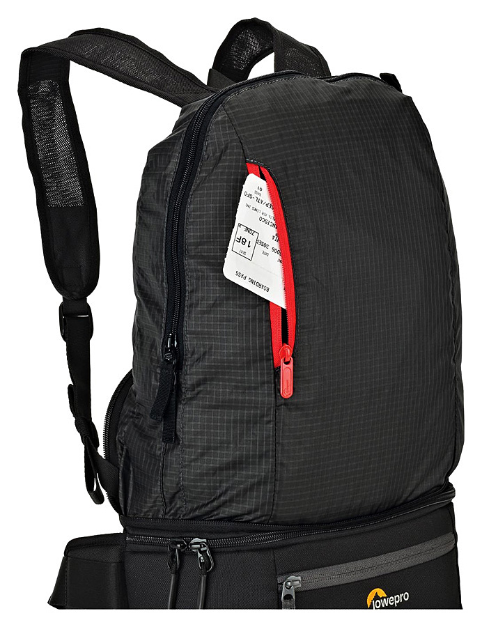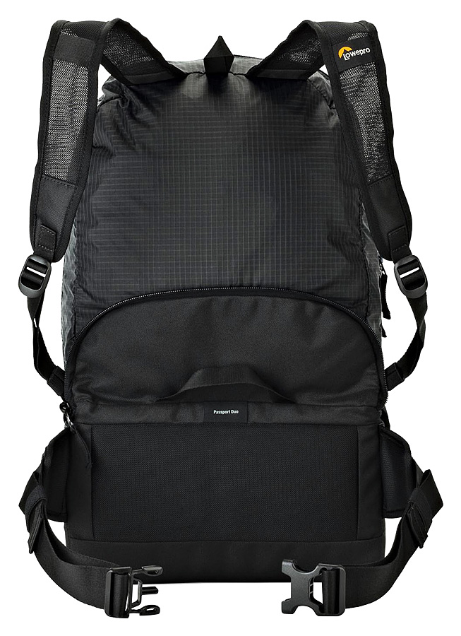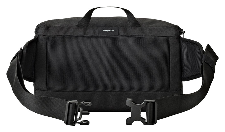 Lowepro Passport Duo je veľmi zaujímavý a originálny koncept dvoch produktov v jednom vyhotovení. V podstate sa jedná o klasickú ľadvinku s výborne vypolstrovanými vnútorným priestorom pre uloženie fototechniky. Na tom by ešte nebolo nič zvláštne, no veko pre prístup k fototechnike ukrýva pod zipsom malé tajomstvo. Tým je rozkladací vak z ľahkej, skladnej ale veľmi pevnej tkaniny, ktorý svojim rozložením vytvorí hornú komoru pre osobné veci. Na chrbte tohto horného vaku sú z vonka prišité jednoduché, odvetrané a dostatočne široké chrbtové popruhy, ktoré sa uchytia v spodnej časti ľadvinky, čím vznikne jednoduchý dvojkomorový fotobatoh. Jeho dobre posltrovaná spodná komora tvorená samotnou ľadvinkou je vo vnútri vybavená vyberateľnými priehradkami na suchý zips, ktoré zabezpečia prispôsobenie jej vnútorného priestoru objemu a tvaru vašej fototechniky. Do hornej komory pohodlne zmestíte, vaše osobné predmety každodennej potreby. Tento unikátny koncept Vám tak poskytuje vysokú variabilitu a použiteľnosť, čo iste oceníte v rôznych situáciách.