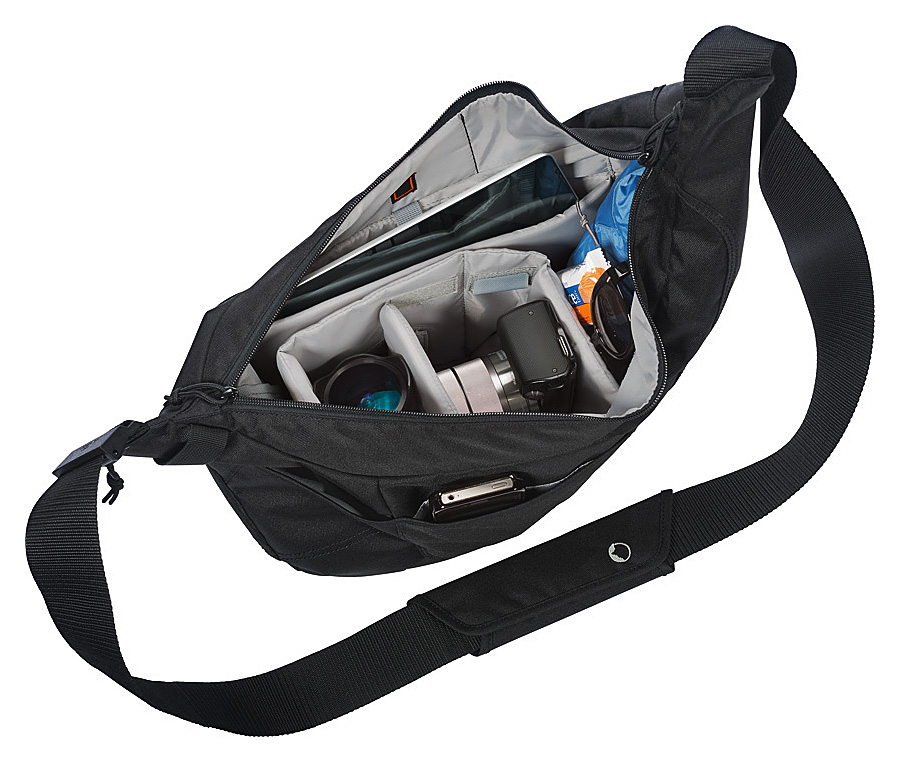 Lowepro Passport Sling III je veľkostne vhodná pre prenos a ochranu kompaktných systémových fotoaparátov CSC, alebo digitálnych jednookých zrkadloviek DSLR s nasadeným základným objektívom. Popri tom sa vo vnútri nájde prietor aj pre ďalší objektív, tablet, osobné veci a ministatív (napr. JOBY GorillaPod SLR-Zoom). Moderný a štýlový dizajn podporuje originálna praktická konštrukcia a ľahké pevné technické materiály. K uloženej technike vo vnútri brašny sa dostanete veľmi rýchlo a pohodlne pomocou dlhého YKK zipsu s dvomi kovovými jazdcami na hornej strane brašny. Vo vnútri brašne nájdete praktickú, vyberateľnú fotovaničku pre uloženie fototechniky, ktorá je výborne polstrovaná a dá sa používať aj samostatne. Fotovanička vo vnútri zaberá zhruba 3/8 objemu hlavnej komory brašny, pričom zvyšná časť je určená pre uloženie osobných vecí, príslušenstva a statívu. Vnútorná kapsa na uloženie tabletu/dokumentov umožňuje uloženie tabletu s veľkosťou až 26,5 x 18 cm. Sieťovaná kapsička na zips sa nachádza na vnútornej stene hlavnej komory a je dostatočne veľká pre bezpečné uloženie vášho mobilného telefónu, kompaktného fotoaparátu a pod. Na vonkajšej strane brašny sú tri samostatné vrecká pre uloženie drobných osobných vecí a fotopríslušenstva. Fotobrašna už tradične disponuje po obvode spodnej strany pozdĺžnym zipsom, ktorý umožňuje po rozopnutí expandovať objem úložného priestoru v brašni.