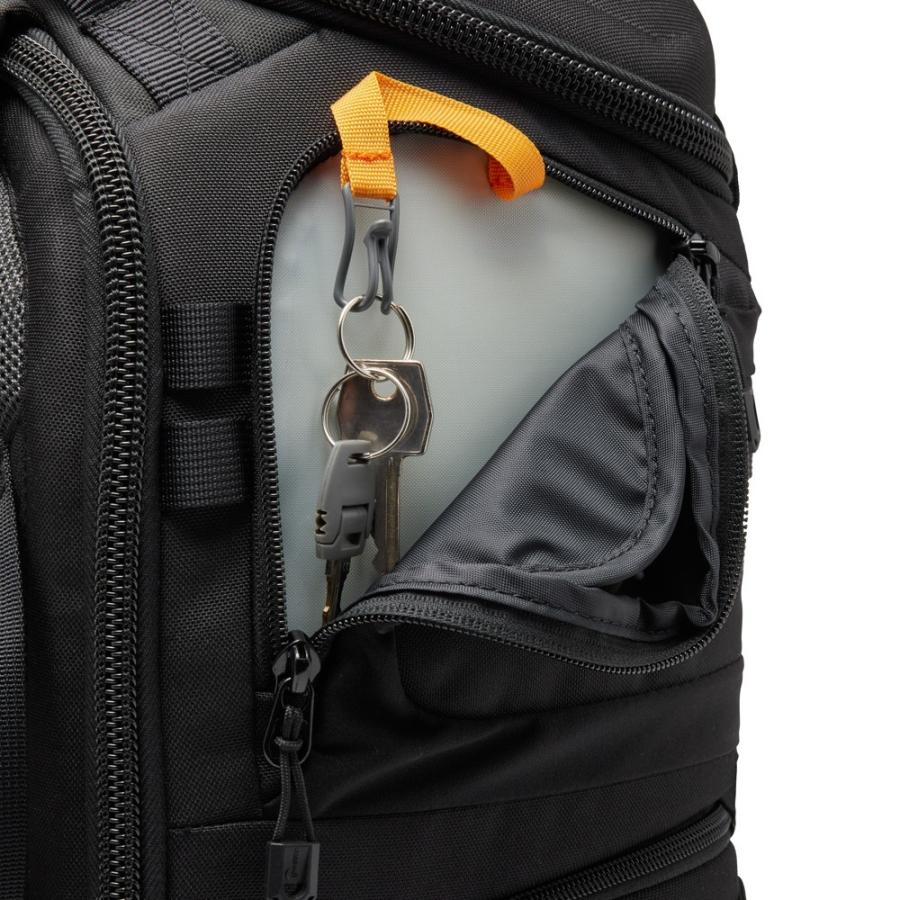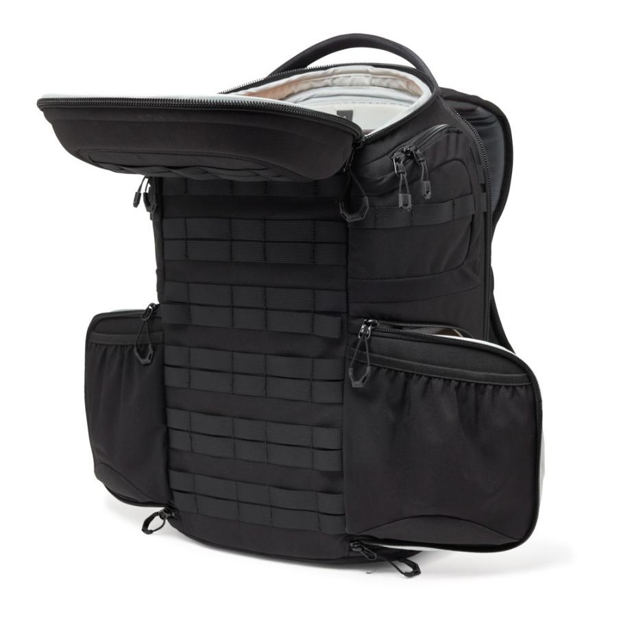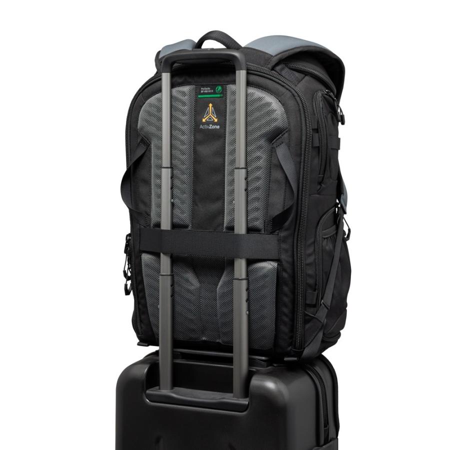 Vnútri zadnej strany sa nachádzajú zipsové priehľadné organizačné priehradky a vrecko CradleFit na notebook, ktoré pojme až 16" MacBook Pro. Bočné vstupy majú veľké vonkajšie pružné vrecká, ktoré pojmú až 1L fľašu, a sú spevnené na spodnej strane pre podporu statívu. Ďalšie pútka a vrecká na hornej časti bokov umožňujú rýchly prístup k veciam a bezpečné pripevnenie statívu. Batoh stojí samostatne, čo uľahčuje manipuláciu a prístup k vybaveniu.