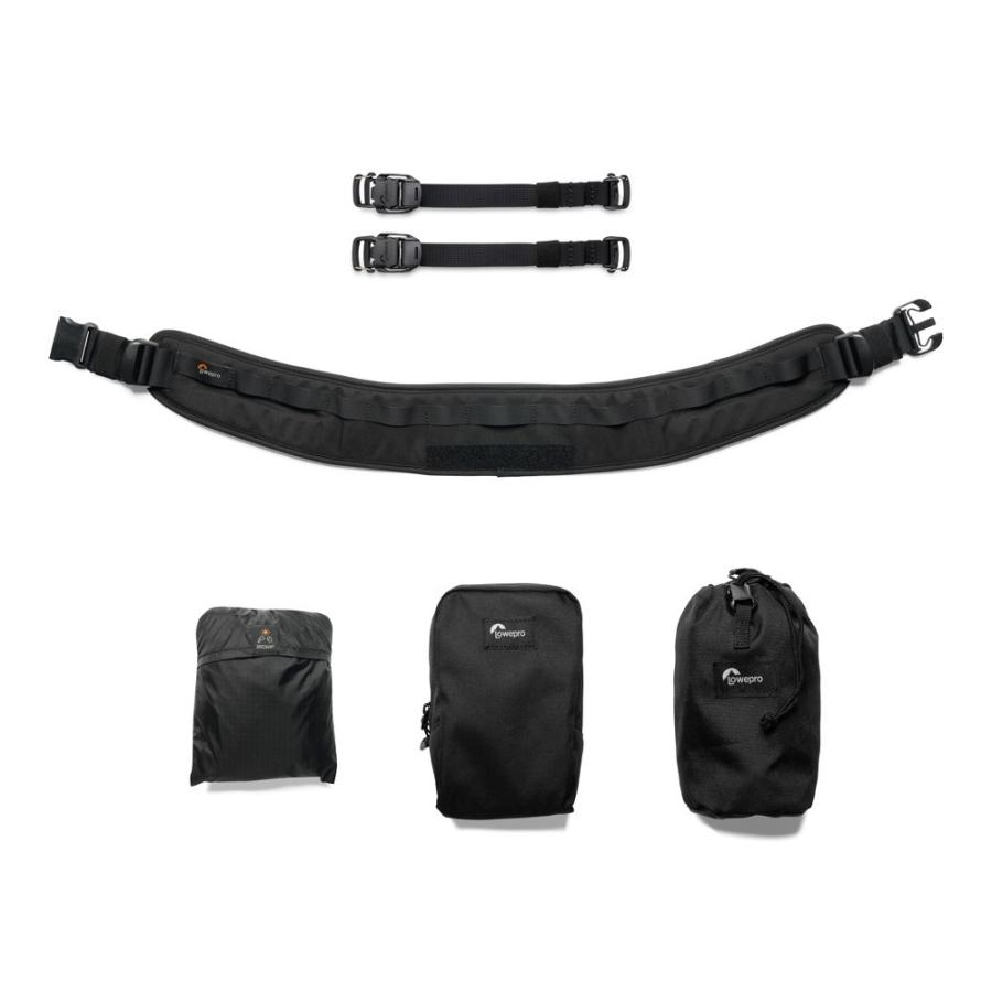 Vonkajšia časť batohu obsahuje hybridný systém popruhov, ktorý obopína batoh spredu nahor aj na páse. Tento systém je kompatibilný so širšími SlipLock™ úchytmi a štandardnými MOLLE alebo PALS vreckami. Súčasťou balenia je nasledujúce príslušenstvo, ktoré je možné pripevniť na SlipLock systém: 1 vrecko na zips, 1 sťahovacie vrecko na fľašu (1l) alebo nohy statívu a 2 Quick Straps s novými uzávermi pre bezpečné uchytenie, 1 pláštenka (AWC).