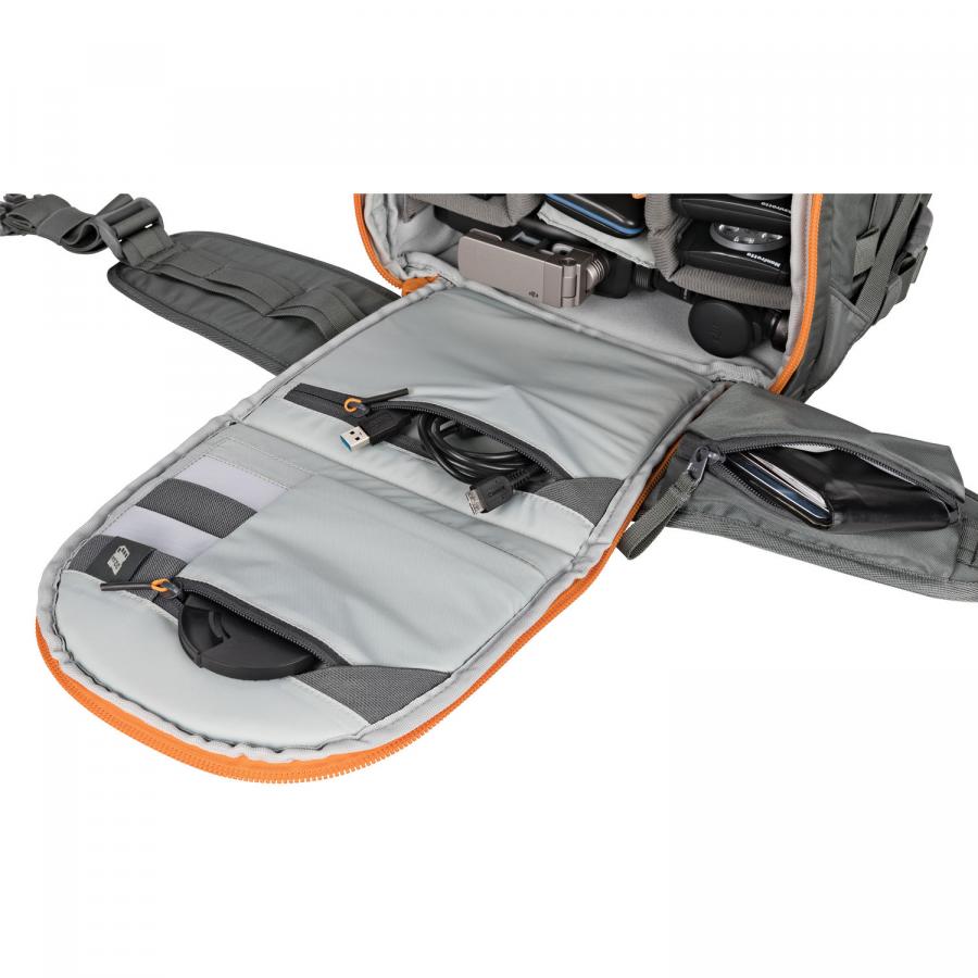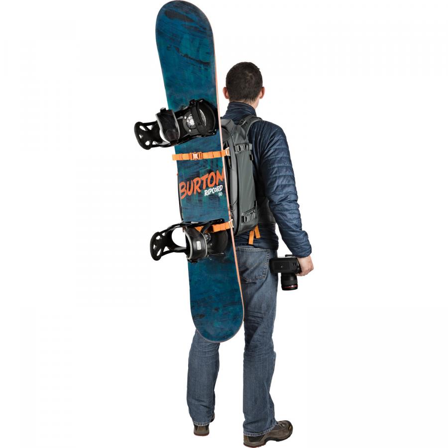 Sofistikovaný systém fixačných pásikov s karabínami a úchytnými okami umožňuje pripevnenie statívu a veľmi ťažké výbavy vrátane lyží alebo "dosky"; uchytené príslušenstvo nebráni prístupu do hlavnej fotokomory