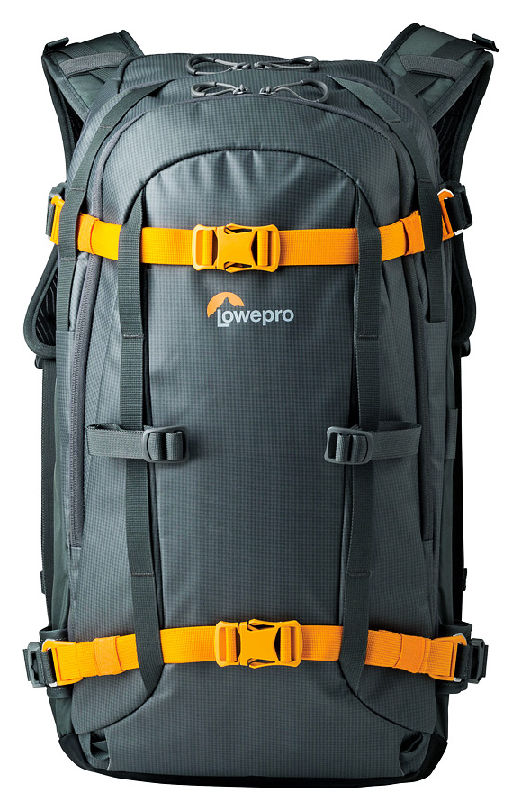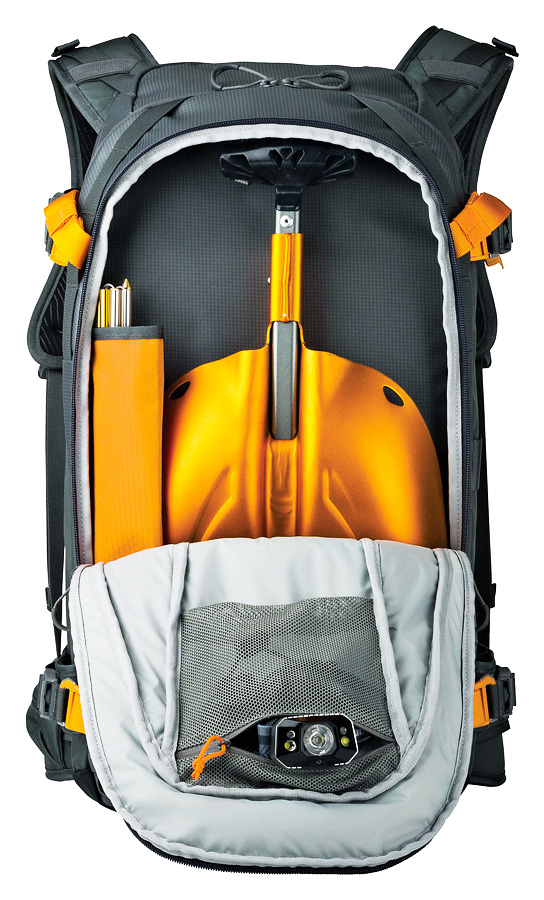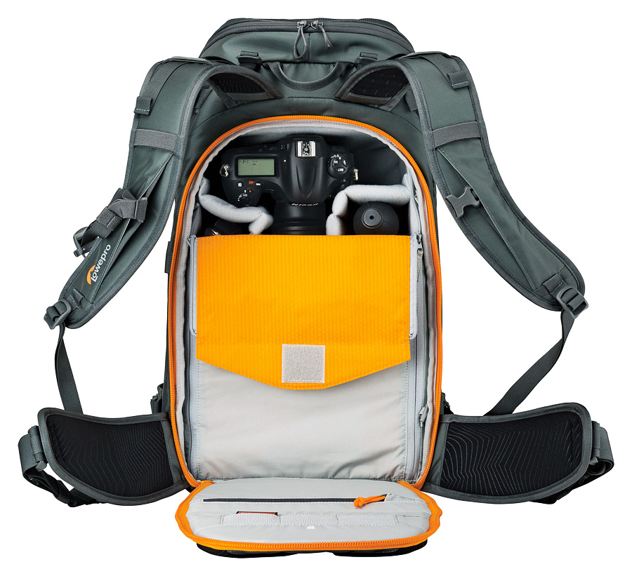 Na prednej strane batoha sa nachádza veľká predná komora, prístupná skrz robustný YKK zips s dvomi kovovými jazdcami, ktorej otváranie je ešte poistené dvojicou oranžových kompresných popruhov s plastovými sponami určenými k uchyteniu outdoor výbavy (snowboard, lyže, lyžiarske/turistické palice, lavínová lopata, lavínová sonda, prilba a pod.). Vo vnútri prednej komory je dostatok priestoru pre uloženie vašich osobných vecí (oblečenie, obutie, potraviny, voda a pod.) ako aj ďalšej outdoor výbavy a fotovýbavy (lezky, lano, sedák, úväzy, malý ministatív a pod.). V hornej časti veka prednej komory je malé sieťované vrecko na zips YKK, určené pre drobné osobné veci (doklady, mobil, peňaženka, kľúče a pod.). Oboma bočnými a hornou stranou batoha prechádza jeden robustný YKK zips s dvomi kovovými bežcami po ktorého otvorení je v prípade potreby možné expanzne zväčšiť objem prednej komory batoha. V takomto prípade dvojica oranžových kompresných popruhov slúži ako opora a vymedzenie expanzie prednej komory. Na ľavej strane batoha sa nachádza úzke vrecko na zips YKK s jedným kovovým bežcom a dvojica kompresných popruhov s plastovými sponami pre uchytenie rôznorodej výbavy (Napr. lyží). Na pravej strane batohu je opäť dvojica kompresných popruhov s plastovými sponami pre uchytenie rôznorodej výbavy a okrem toho je tam ešte našitý popruh do ktorého je možné chytiť nohu statívu. Na prednej strane batohu je dvojica kompresných slučiek a sú tu našité dve páskové reťaze na ktoré je možné uchytiť čokoľvek od karabína a expresiek až po puzdra systému SlipLock™. Posledným úložným priestorom tohto skvelého fotobatohu je organizačné vrecko na hornej strane batohu, prístupné zo zadnej strany batoha cez zips YKK s dvomi kovovými bežcami. Vrecko je určené pre uloženie drobnej osobnej výbavy ako aj pre uloženie okuliarov (slnečných, lyžiarskych a pod.). K tomuto účelu je vnútrajšok vrecka je vybavený organizérom vecí s úchytkou na kľúče, malým sieťovaným vreckom na veku vrecka a trickot brush vnútorným materiálom aby sa vo vrecku odložené okuliare nepoškriabali.