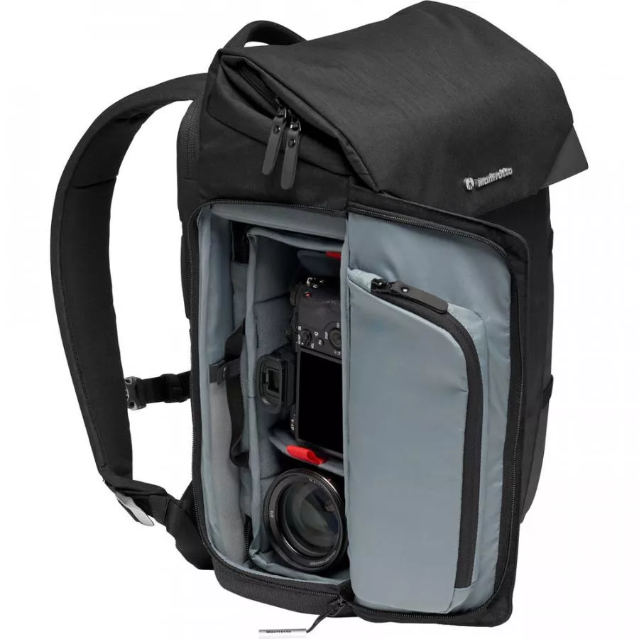 Po odstránení elastických deličov zo syntetických vlákien z etylenvinylacetátu (EVA) možno razom premeniť tento fotobatoh na cestovný batoh. Tieto deliče navrhnuté na mieru majú možnosť sa v prípade potreby vyklopiť alebo povytiahnuť, aby bolo vaše zariadenie ochránené aj vo veľmi nečakaných situáciách. Batoh je vybavený renomovaným ochranným systémom Manfrotto Slim-Tech, ktorý ochráni vaše vybavenie pred nárazmi. Spodná časť batohu je vyrobená z odolných kevlarových vlákien, ktoré batohu zaistia extrémnu odolnosť proti poškodeniu. Použité sú tiež prémiové pracky Duraflex a zipsy YKK.