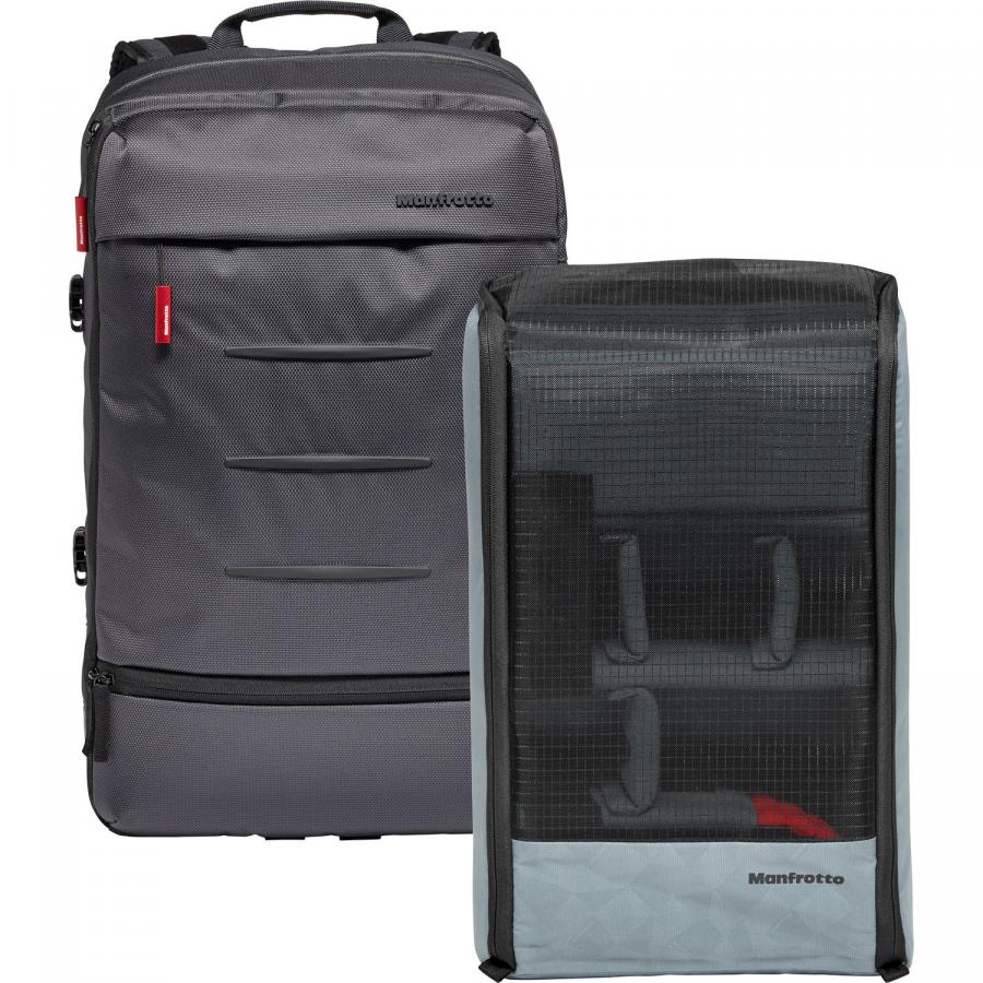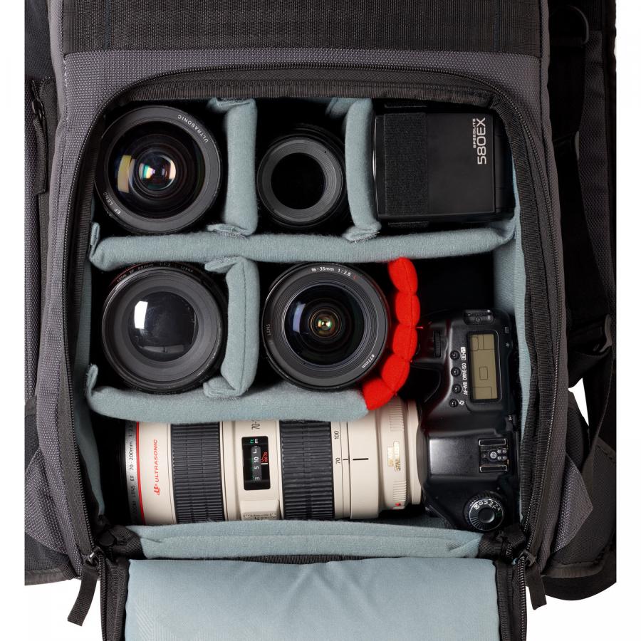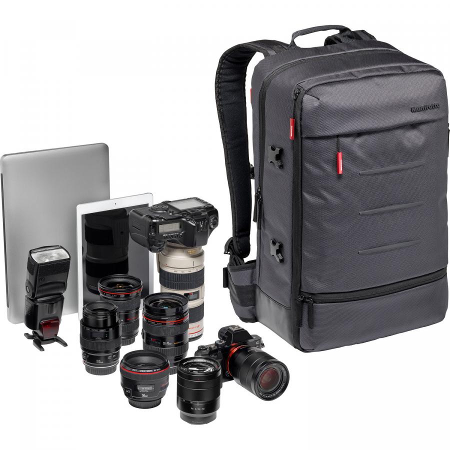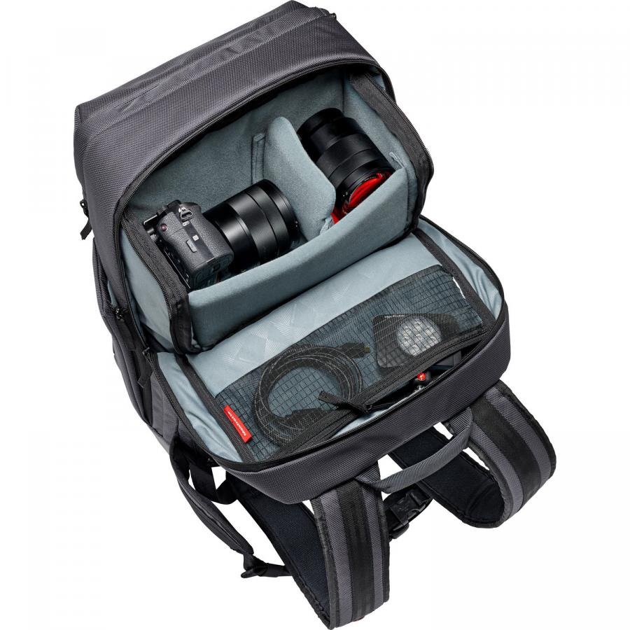 Vnútorná odnímateľná vložka umožňuje prenášať foto vybavenie aj bez batohu. Extrémne funkčné vnútorné puzdro je vybavené novým Flexy Camera Shell, inovatívnym ochranným systémom vyvinutým firmou Manfrotto. Batoh je dostatočne veľký pre uloženie DSLR s pripojeným objektívom 70-200 / 2.8 plus až 4 objektívy s bleskom. V hornej časti je priestor pre bezzrkadlový fotoaparát (systémový kompakt), ako je rad Sony A7 alebo Fujifilm XT so štandardným zoomovým objektívom plus jeden ďalší objektív. Zariadenie môžete vybrať za použitia bezpečného zadného prístupu alebo ľahkého horného prístupu. Na prednej strane je systém Tripod NeverLose, ktorý umožňuje nosiť statív, cyklistickú prilbu, skateboard, osobné predmety, ako je bunda alebo dokonca dron. Batoh sa zmení na malý elegantný batoh Manfrotto Manhattan tým, že zopnete a utiahnete dva popruhy na prednom paneli. Na druhej strane má dve polstrované odkladacie priehradky, ktoré držia notebook 15,6 "a tablet 10". Ak so sebou nepotrebujete fotoaparát, môžete jednoducho vybrať vnútorné puzdro a použiť batoh na každodenné nosenie.