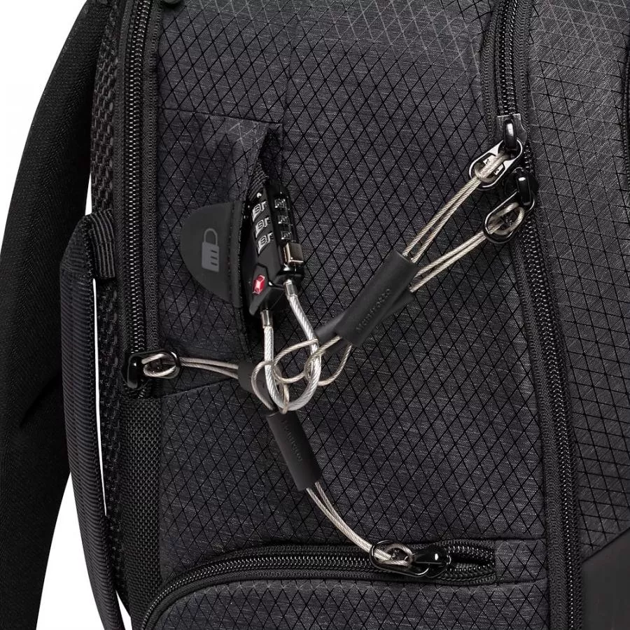Oddeľovače M-Guard™ sú vyrobené z peny EVA s vysokou hustotou, ktorá poskytuje výnimočné tlmenie nárazov pri zachovaní super tenkého profilu. SAS-TEC, viskoelastická pamäťová pena a viacúčelová odolnosť, navyše pridáva na spodnej časti batohu štrukturálnu výstuž, ktorá poskytuje extra tlmiace vlastnosti. Pre ešte lepší bezstarostný zážitok je možné použiť visiaci zámok schválený TSA na zaistenie oceľového drôtu na uzamknutie hlavnej priehradky.