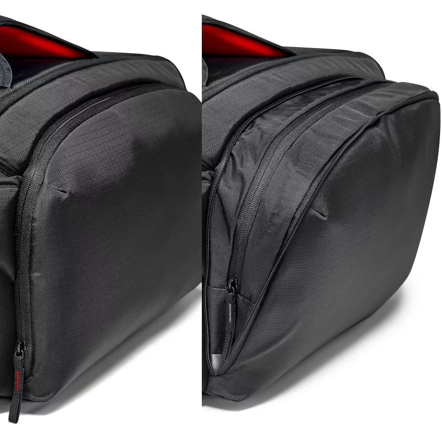 Vstup na zip odkrývá přepážky Manfrotto Flexi, které nejenže přispívají k redukci otřesů a vibrací, ale také se ohýbají tak, aby vyhovovaly přesně vašemu vybavení. Oblast objektivu je chráněna polštářkem. K dispozici je i rozšiřitelná kapsa na větší předměty i kapsa pro vaše další náležitosti umístěná po celé délce brašny.