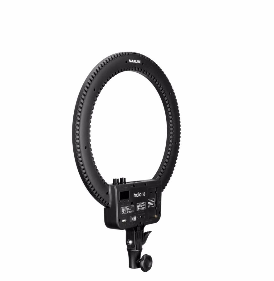 LED kruhové svetlo Halo 16 možné napájať dodávaným AC adaptérom. Vďaka štandardnému 5/8 "závitu môže byť kruhové svetlo upevnené na takmer akýkoľvek svetelný statív (nie je súčasťou dodávky).
