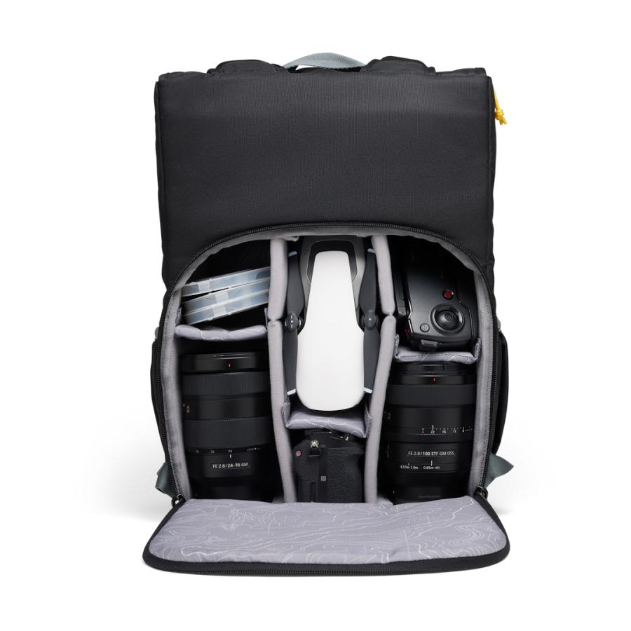 Batoh je ideálny pre digitálne zrkadlovky a bezzrkadlovky s 3-4 dodatočnými objektívmi. Môžete v ňom taktiež uložiť svoj dron, ovládač, nabíjačku a príslušenstvo. Na bočných stranách plecniaka sú pružné vrecká, kam si môžete dať vodu alebo malý statív.