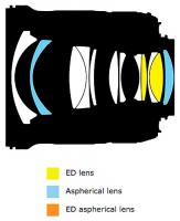 Stavba objektívu: 12 šošoviek v 9 skupinách s dvomi asférickými a dvomi ED členmi
