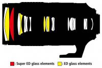 Optická sústava teleobjektívu je zostavená z 20 šošoviek zoradených do 12 skupín pričom využíva štyri prvky zo špeciálneho ED skla (Extreme Dispersion - extrémne nízky rozptyl svetla) a jeden zo špičkového Super ED skla. Tieto prvky pomáhajú korigovať farebnú vadu spôsobenú chromatickou aberáciou, ktorá sa môže prejaviť pri použití dlhšej ohniskovej vzdialenosti.