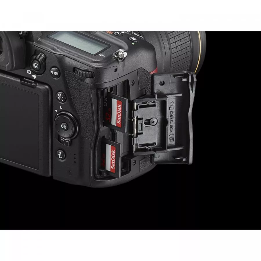 Duálny slot na kartu: 2 karty Secure Digital (SD), kartu v slote 2 možno používať na ukladanie po zaplnení alebo na záložné ukladanie, prípadne na oddelené ukladanie snímok NEF (RAW) a JPEG. Medzi kartami možno snímky kopírovať.