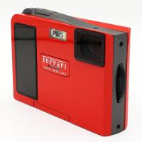 Celokovový kompaktný fotoaparát v červenej farbe Ferrari, z limitovanej edície 10 000 sád, v stave ako nový, s červenou dokovacou stanicou, všetkými káblami, čiernym koženým puzdrom s logom Ferrari a červeným prešívaním, čiernym koženým remienkom na nosenie, návodom a súvisiaci písomný materiál, CD s návodom, prezentačná krabica výrobcu, vonkajšia krabica.