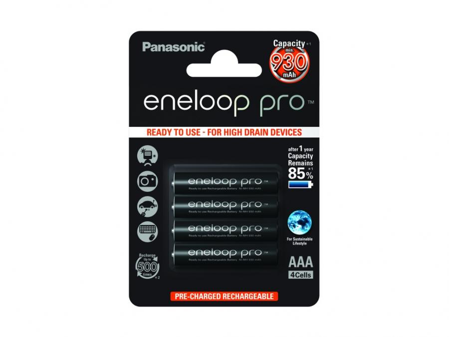 Panasonic Eneloop Pro 4xAAA 930mAh je sada 4ks Ni-MH nabíjateľných batérií Sanyo Eneloop XX AAA 930mAh. Ni-MH nabíjateľné batérie Panasonic Eneloop Pro AAA 930mAh sa v balení dodávajú prednabité. Pracujú s napätím 1,2V a počas ich celkovej životnosti ich dokážete nabiť viac ako 500x pričom ich minimálna kapacita je až 930mAh. Po rokou od posledného nabíjania si dokážu batérie udržať až 85% nabitej kapacity.