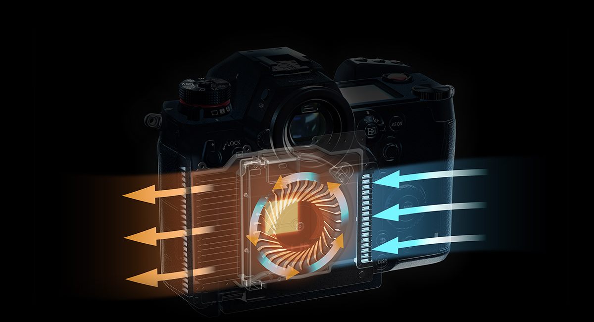 LUMIX S1H, ako vôbec prvá celorámová digitálna jednooká bezzrkadlovka*, obsahuje ventilátor ako štandardné vybavenie (táto funkcia sa zvyčajne nachádza len v profesionálnych fotoaparátoch). Ventilátor je súčasťou novovyvinutej štruktúry na rozptyl tepla, ktorá podporuje neobmedzené nahrávanie videa. Túto novú štruktúru dopĺňajú aj ďalšie funkcie: konštrukcia odolná voči prachu a striekajúcej vode**, nízke vibrácie s minimálnym účinkom na systém stabilizácie obrazu a mimoriadne tichý výkon. Ventilátor možno používať so štyrmi odlišnými nastaveniami. AUTO1 napríklad spustí ventilátor čoskoro po začatí snímania, aby sa teplo udržiavalo na nízkej úrovni a uľahčilo sa dlhšie snímanie. AUTO2 uprednostňuje tichý výkon a necháva ventilátor vypnutý čo najdlhšie.