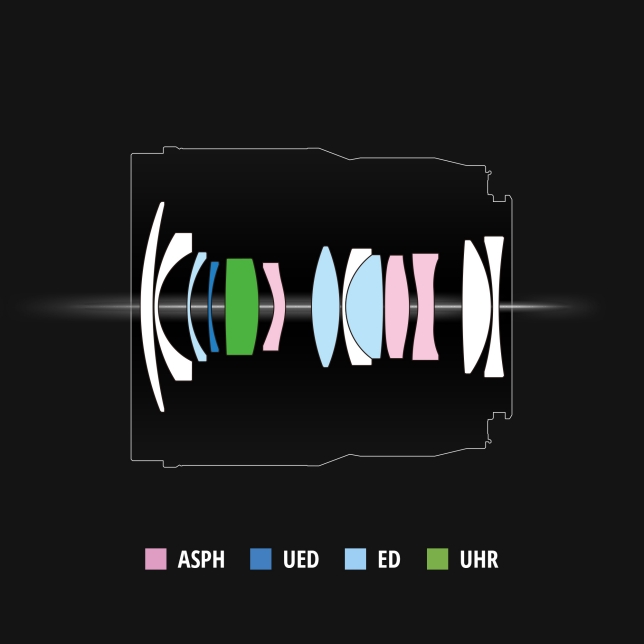 Optimalizovaná konfigurácia obsahuje 13 prvkov v 12 skupinách vrátane 3 šošoviek ASPH, 1 šošovky UED, 3 šošoviek ED a 1 šošovky UHR na minimalizáciu chýb, čím sa dosahuje vynikajúce rozlíšenie.