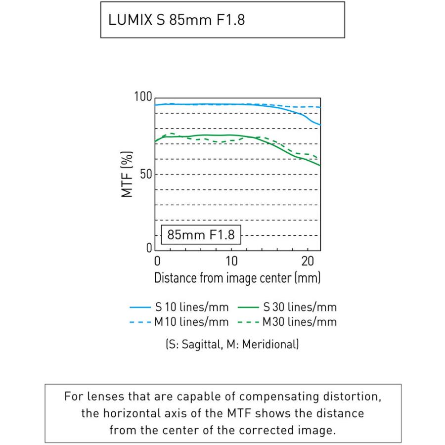 Model LUMIX S 85 mm F1.8, ktorý sa vďaka svojim kompaktným rozmerom a nízkej hmotnosti môže pochváliť vysokou mobilitou, je určený pre všetkých profesionálnych i amatérskych fotografov, ktorí sú priaznivcami portrétnej fotografie. Konštrukcia objektívu využíva 9 elementov v 8 skupinách a dva ED (Extra-Low Dispersion) členy. Vďaka tomu účinne potláča nielen axiálne chromatickú aberáciu, ale aj chromatickú aberáciu zväčšenia.