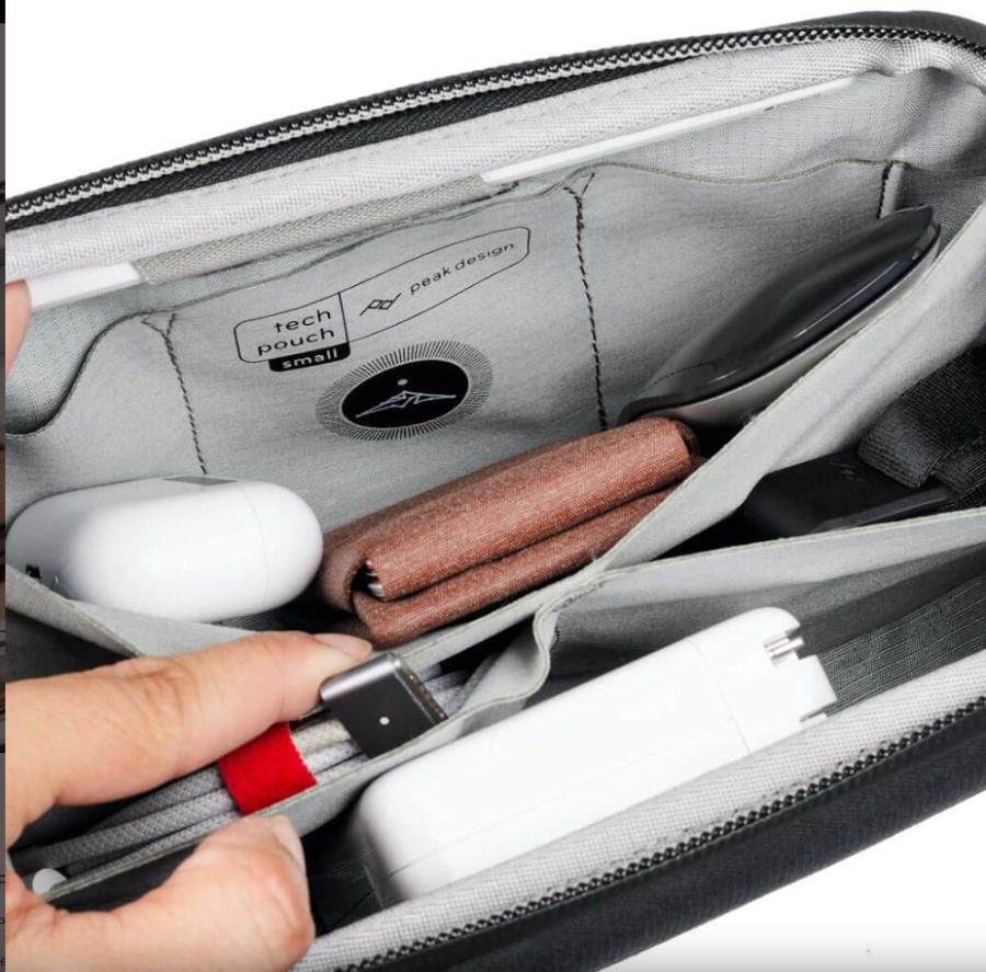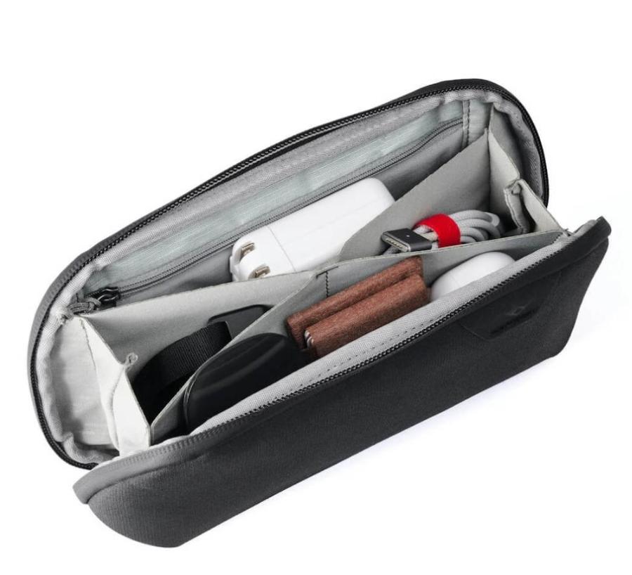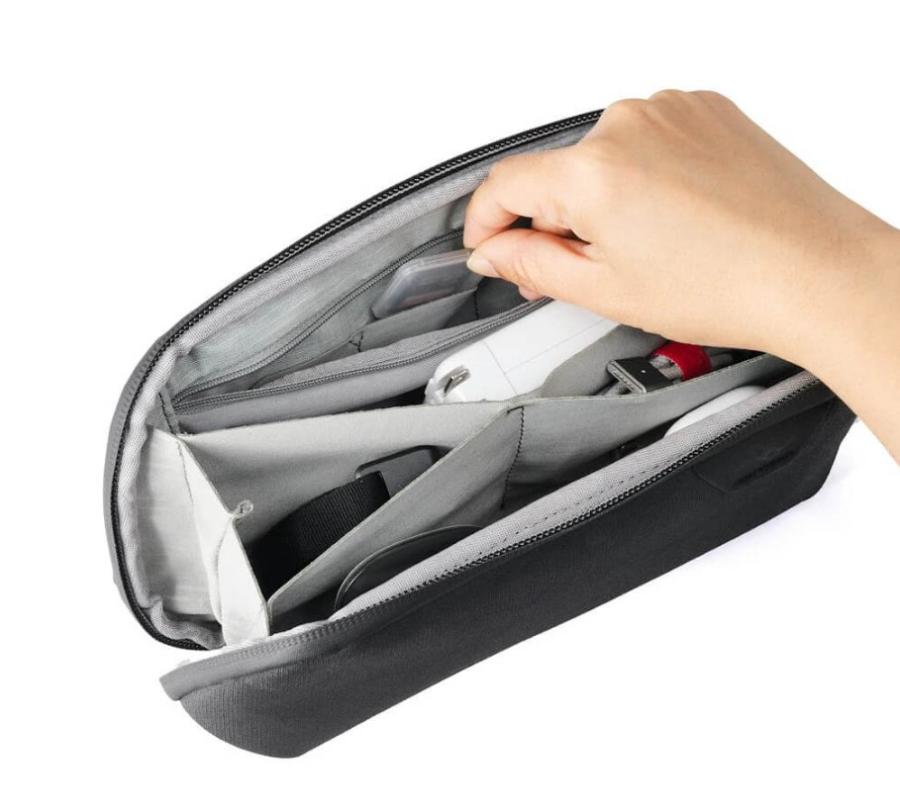 Prepážky v štýle origami ponúkajú obrovskú priestorovú efektivitu. Umožní ti zbaliť viac vecí, než by si očakával, do malého priestoru. Súčasne je všetko úhľadne usporiadané. Uchovávaj predmety ako sú káble, batérie, ceruzky a SD karty ľahko prístupné pomocou elastických slučiek na príslušenstvo.