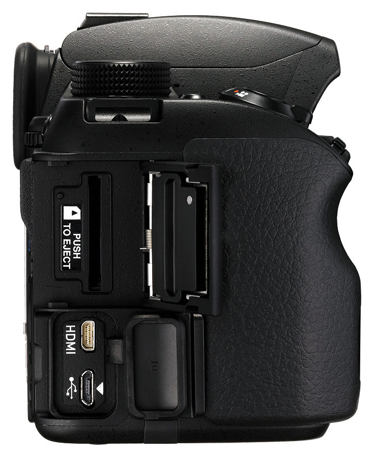 • Konektory: Hi-Speed USB 2.0 (micro B), Konektor pre externé napájanie, Konektor pre káblovú spúšť, X-Synchro kontakt, Konektor pre HDMI (Typ D), Konektor pre mikrofón (3,5mm mini-jack), Konektor pre sluchadlá (MSC/PTP)