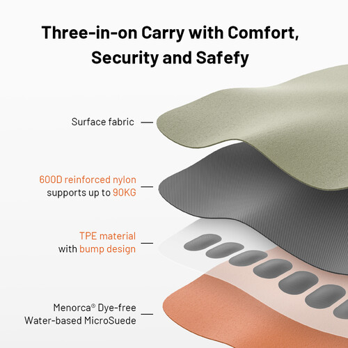 Pohodlne noste fotoaparát okolo krku alebo cez rameno pomocou tohto popruhu na fotoaparát Air od spoločnosti PGYTECH. Má nastaviteľnú dĺžku od 100cm do 140cm a je vyrobený z priedušného nylonu 600D šetrného k životnému prostrediu. Opletená šnúrka Dyneema má rýchle korálkové konektory, takže v prípade potreby môžete fotoaparát rýchlo odpojiť. Šnúrka unesie až 90kg a mala by sa vymeniť, keď sa žltá vrstva stane viditeľnou.